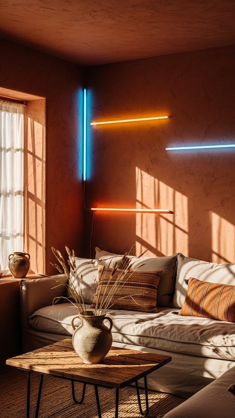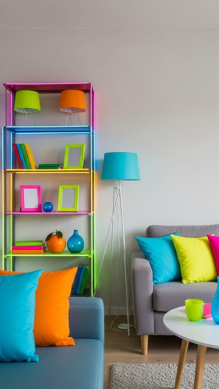 You’ll balance restraint with daring: add neon trim on shelving, lamps, or frames and swap muted throws for chromatic cushions. These targeted sparks energize rooms without overwhelming them, letting you express freedom through color while preserving a calm, cohesive aesthetic.