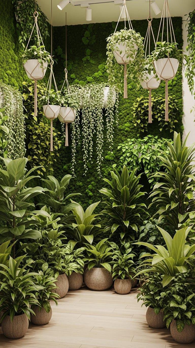 You’ll create a liberated, serene vibe with vertical mosswalls, trailing vines, and sculptural hanging planters. Mix leaf shapes, heights, and natural pots for tactile contrast; add subtle lighting to highlight foliage and keep the space airy, personal, and calm.