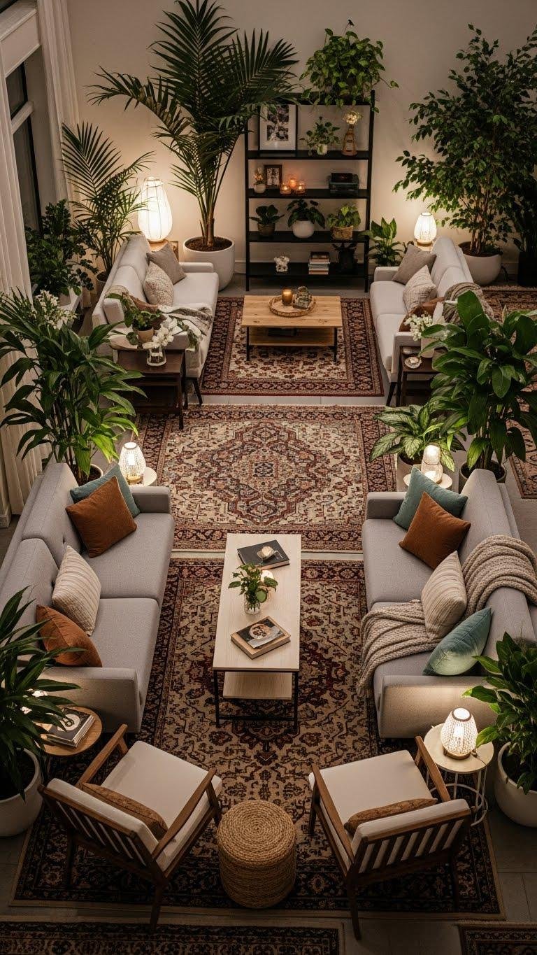 Complementing your living greenery with a thoughtful furniture layout makes the room feel intentionally held for conversation and comfort. You’ll craft conversation clusters by angling sofas and chairs toward one another, layering rugs and low tables to invite linger.