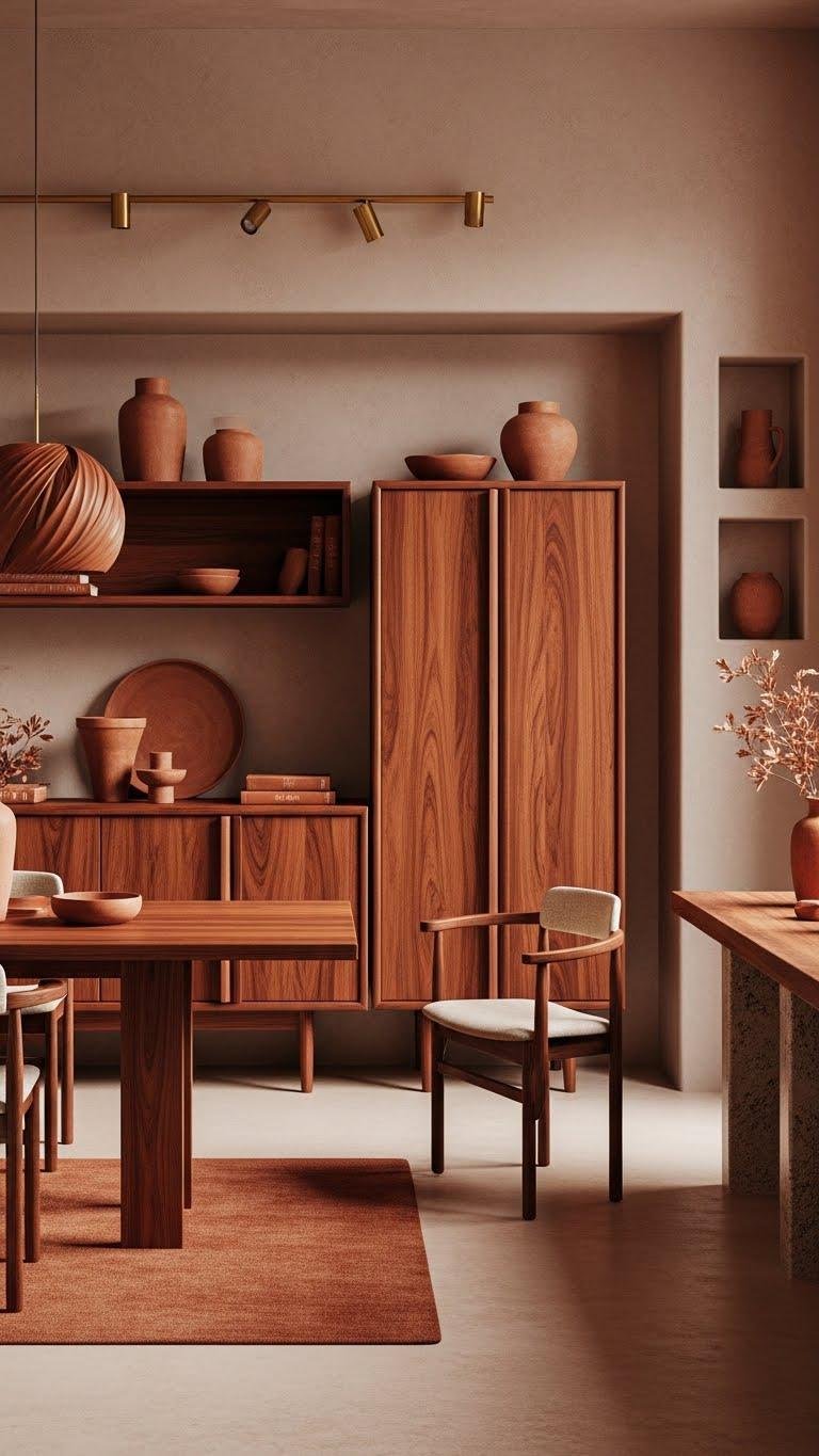 You’ll anchor spaces with mahogany terracotta furniture and ceramics, layer matte plaster walls, and introduce brass accents to amplify warm contrast.