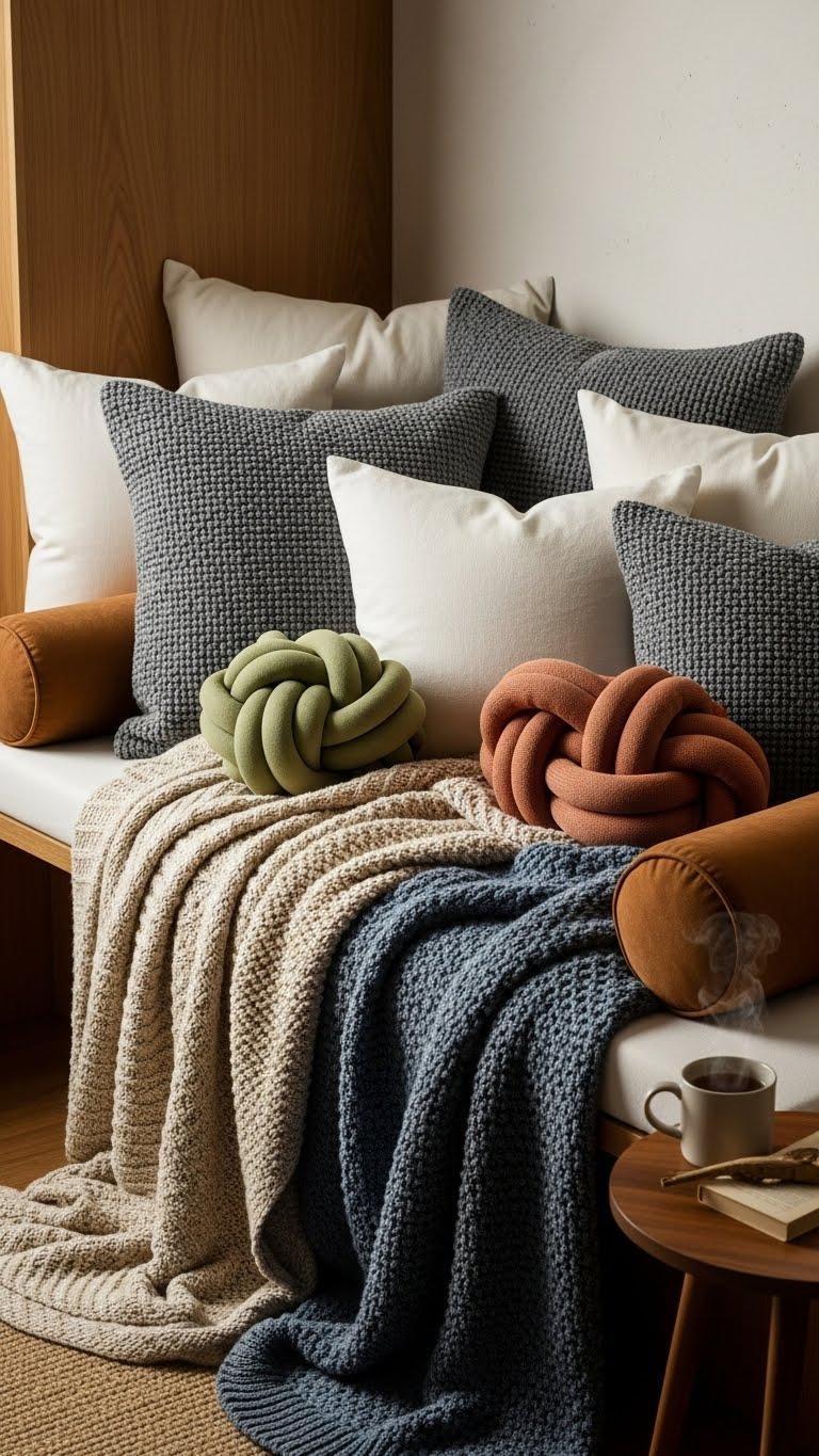 You’ll mix suede bolsters with airy linen shams, add knotted lumbar pillows for sculptural charm, and layer knits to invite lingering.