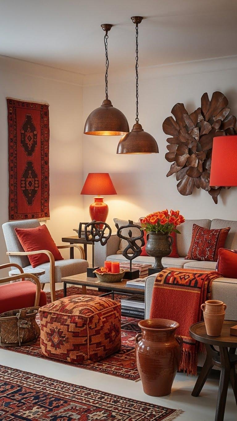 Lean into rich red-orange accents to lift and define your clay-toned palette; these hues bring warmth and a magnetic focal point without overpowering the room.