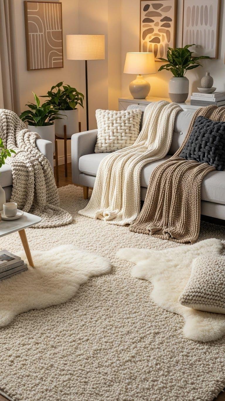 After mixing linen, cotton, wool, and jute, bring in sheepskin and alpaca throws to add a plush, tactile counterpoint that heightens comfort without overpowering the room.