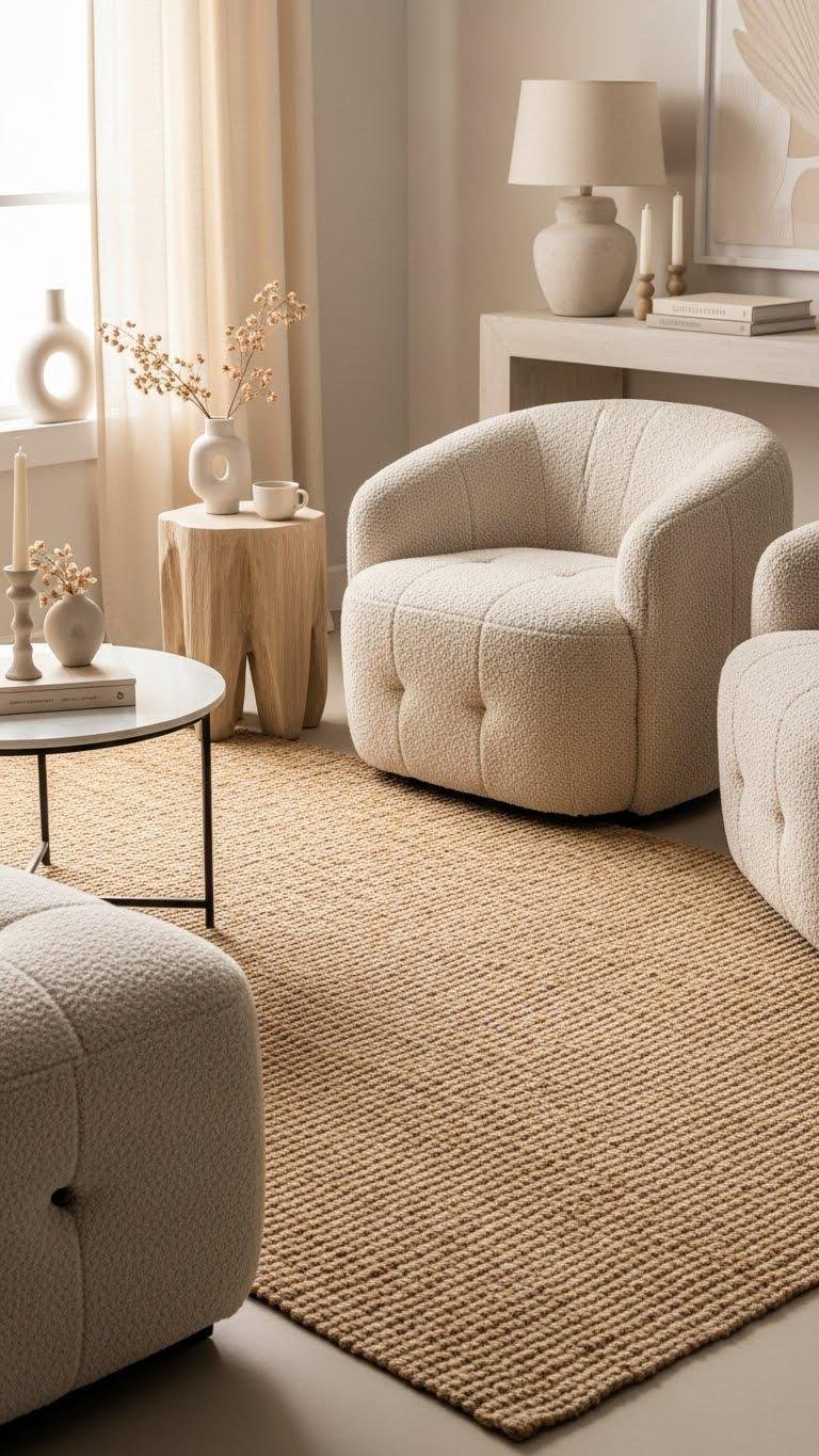 Contrast is your secret weapon when pairing natural jute rugs with pillowy bouclé chairs: the jute grounds the room with organic texture and warmth, while the bouclé adds soft, tactile luxury that invites sitting.