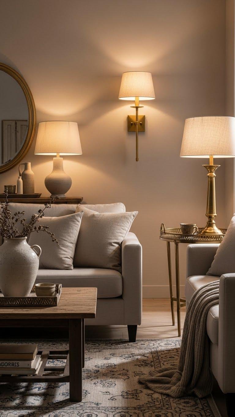 A brass sconce with a linen shade instantly warms a room while keeping lines clean and simple. You’ll pair antique brass fixtures with neutral linen shades to create a modern patina contrast that feels alive, not fussy.