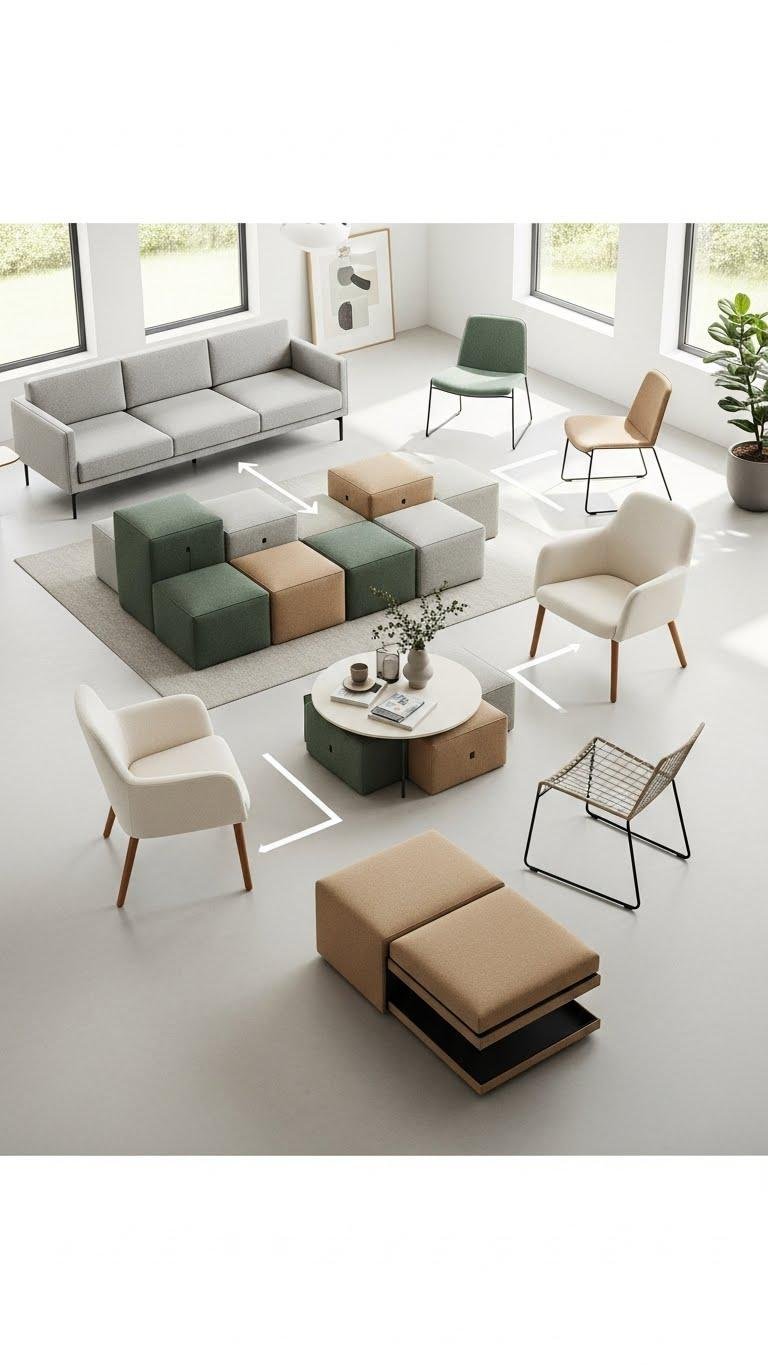 Think in zones: map out adaptable seating pockets that respond to how you live, not just how a room looks. You’ll group a slim sofa, a modular pouf and chairs into flexible clusters that shift from solo work to lively gatherings. Keep pathways clear, choose pieces that tuck or stack, and add a pop up ottoman for instant extra seating without sacrificing clean, airy flow.
