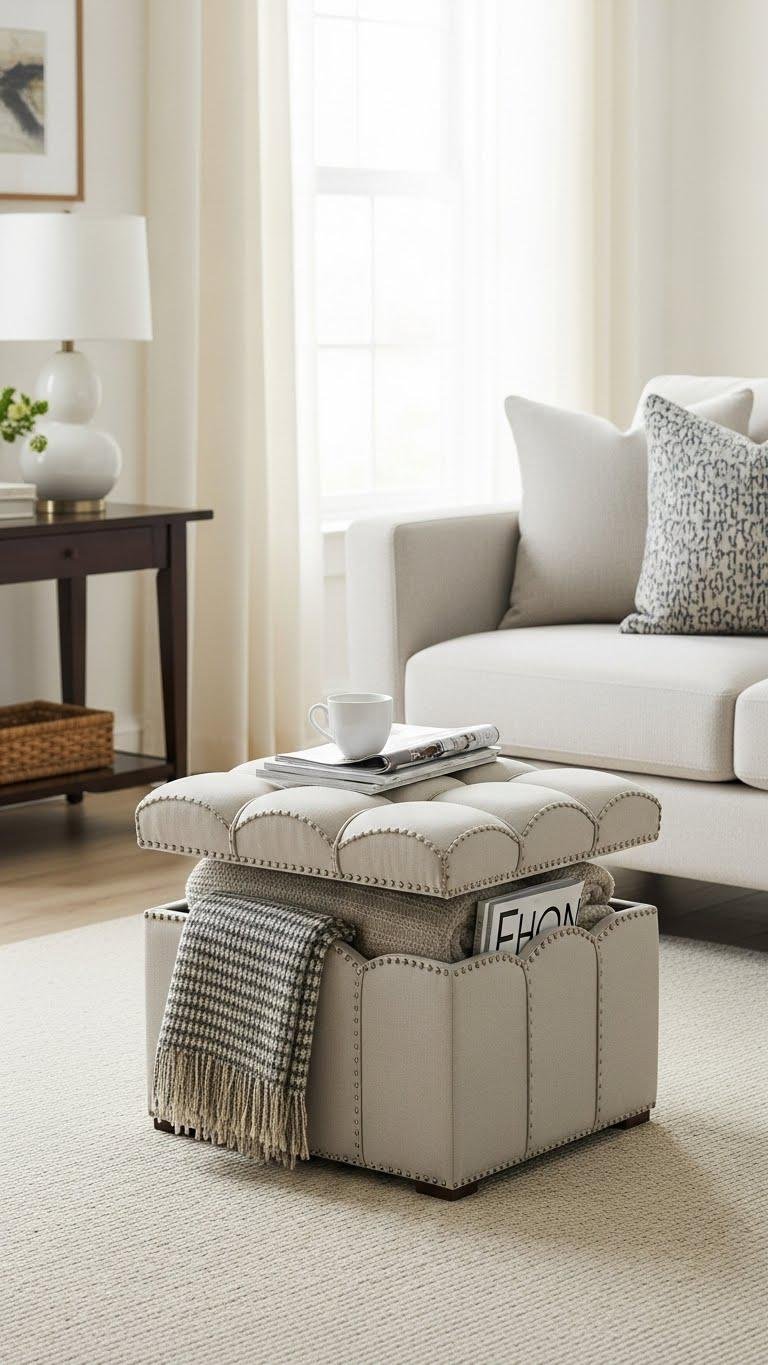 Use a neutral hue to keep openness, and opt for a compact storage ottoman to hide throws or mags. It frees space and reads intentionally refined.