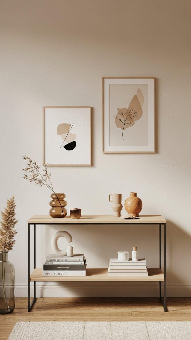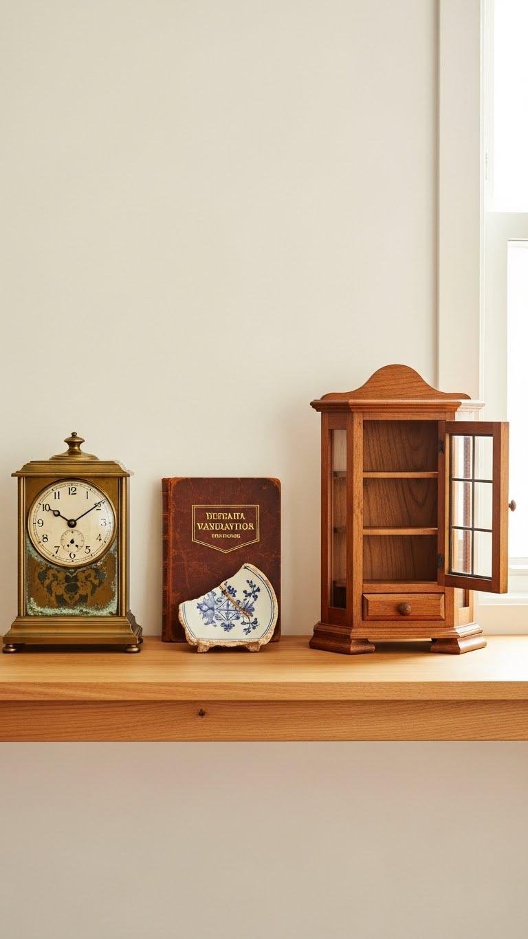 Bring together a small, edited selection of vintage objects to give your warm minimalist space personality without clutter. Choose pieces with patina storytelling—an old brass clock, worn leather book, or ceramic shard—to anchor a shelf or console.