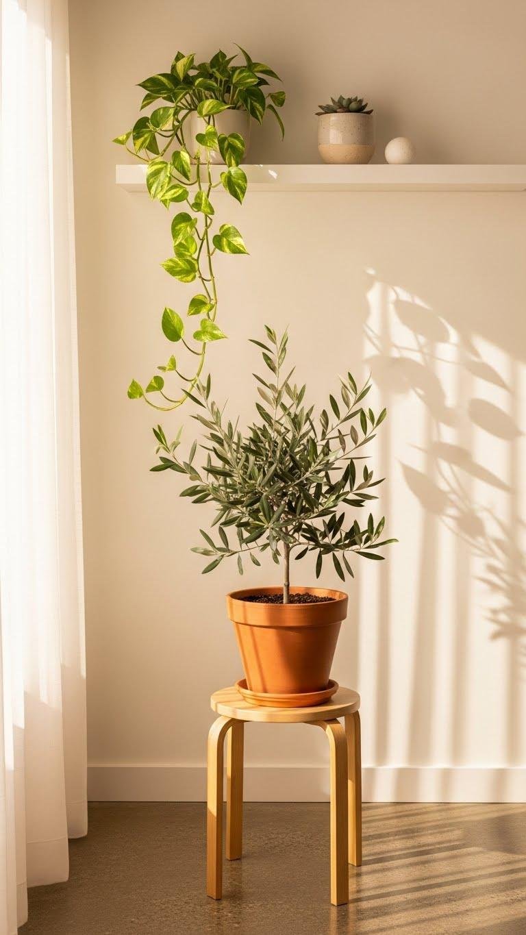 You’ll place a potted olive by a sunlit corner and let its sculptural leaves breathe. Add a trailing pothos on a shelf to soften edges and invite movement.
