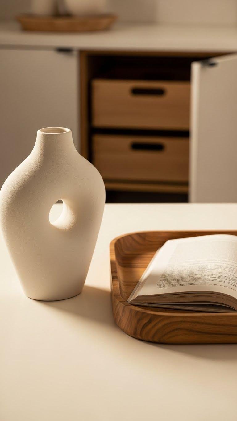 Edit surfaces down to a few deliberate pieces that earn their place: a sculptural vase, a well-made tray, and one book or a framed photo. You’ll practice single item curation, choosing items with purpose and texture.