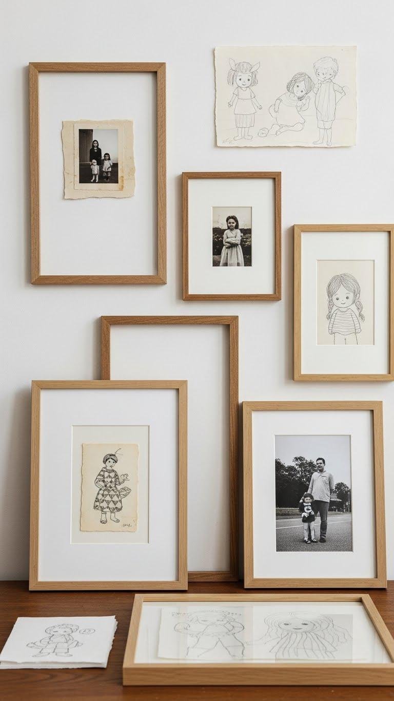 Personal sketches and found photographs gain quiet power when you frame them in simple, natural frames—think unfinished wood, thin oak, or bamboo—that let the work breathe and the room stay calm.