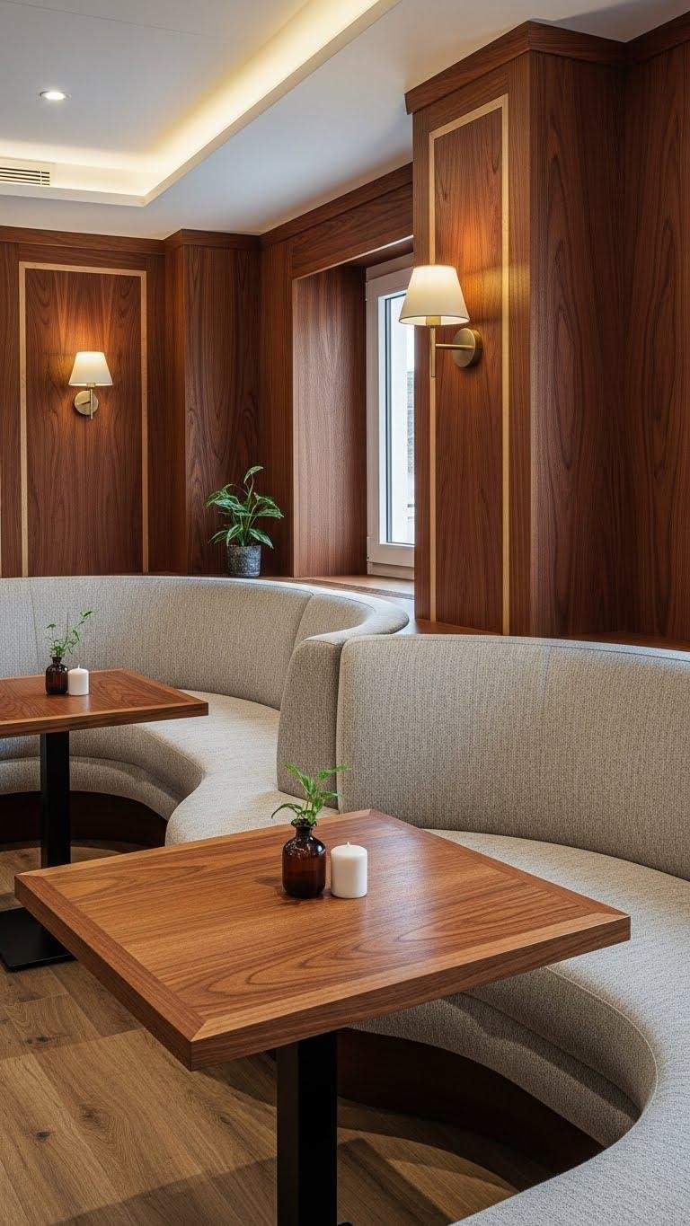 Choose sculptural curved lounge chairs and low-profile semicircular banquettes to define zones without bulk. You’ll enjoy an open, liberated feel—seating that invites lingering while preserving negative space and a calm, purposeful aesthetic.