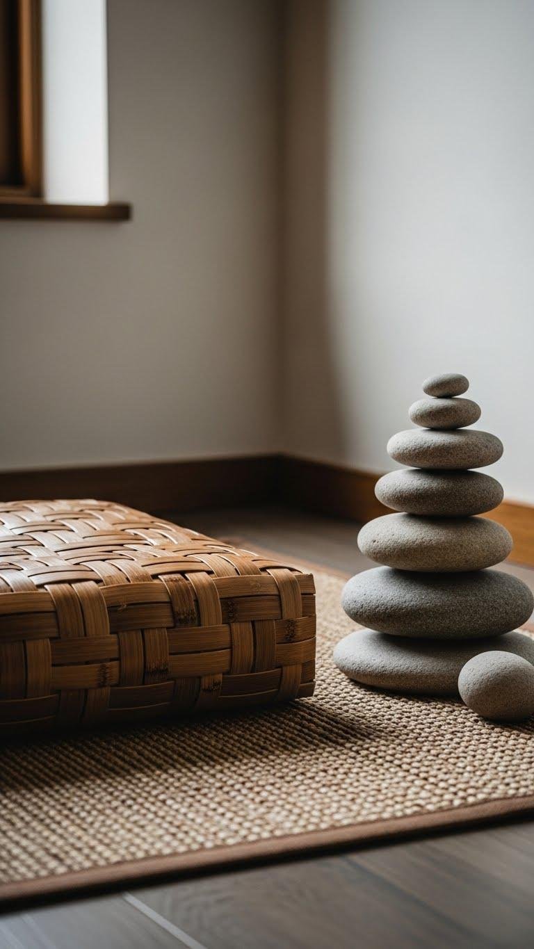 When you carve out a meditation corner using natural materials, you’ll reinforce the warm minimalist aesthetic while keeping the space calm and focused. Choose a low bamboo cushion, a simple mat, and a river stone altar to anchor intention.