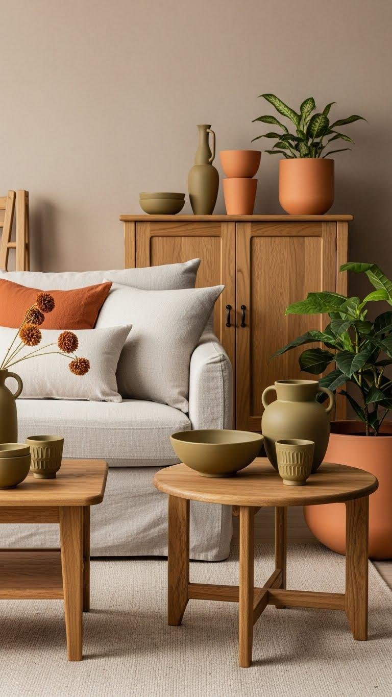 Introducing olive green plants adds a restrained, organic pop that complements warm minimalism without stealing the spotlight.