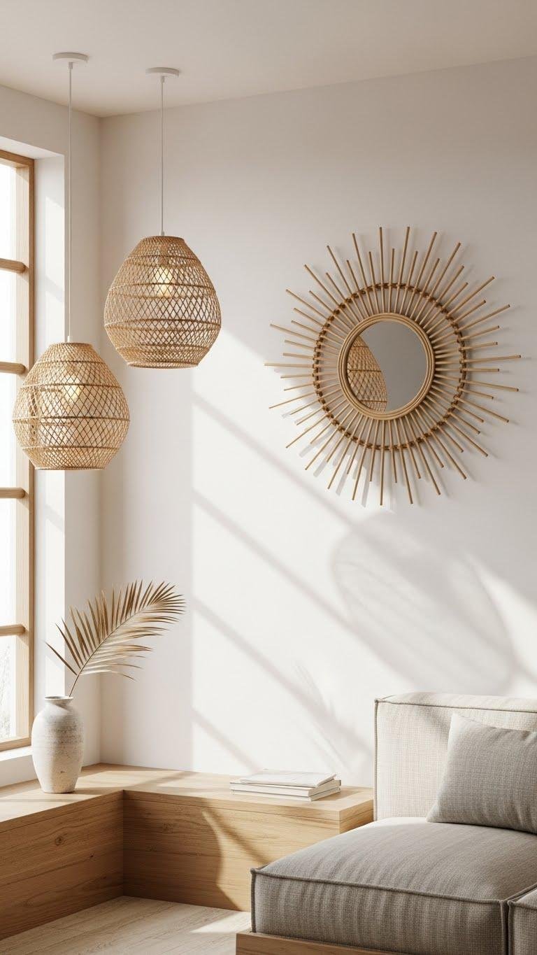 Bring in rattan and woven pieces to add organic texture and subtle contrast without cluttering your minimalist scheme. Choose a sunburst rattan mirror as a focal point and pair it with woven pendant lights to lift warmth and light.
