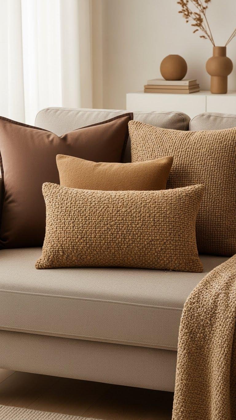 When you choose mocha and camel pillows, pick pieces that anchor the room with warm, restrained color rather than compete with it. You’ll favor mocha gradients for subtle depth and camel textures for tactile calm.
