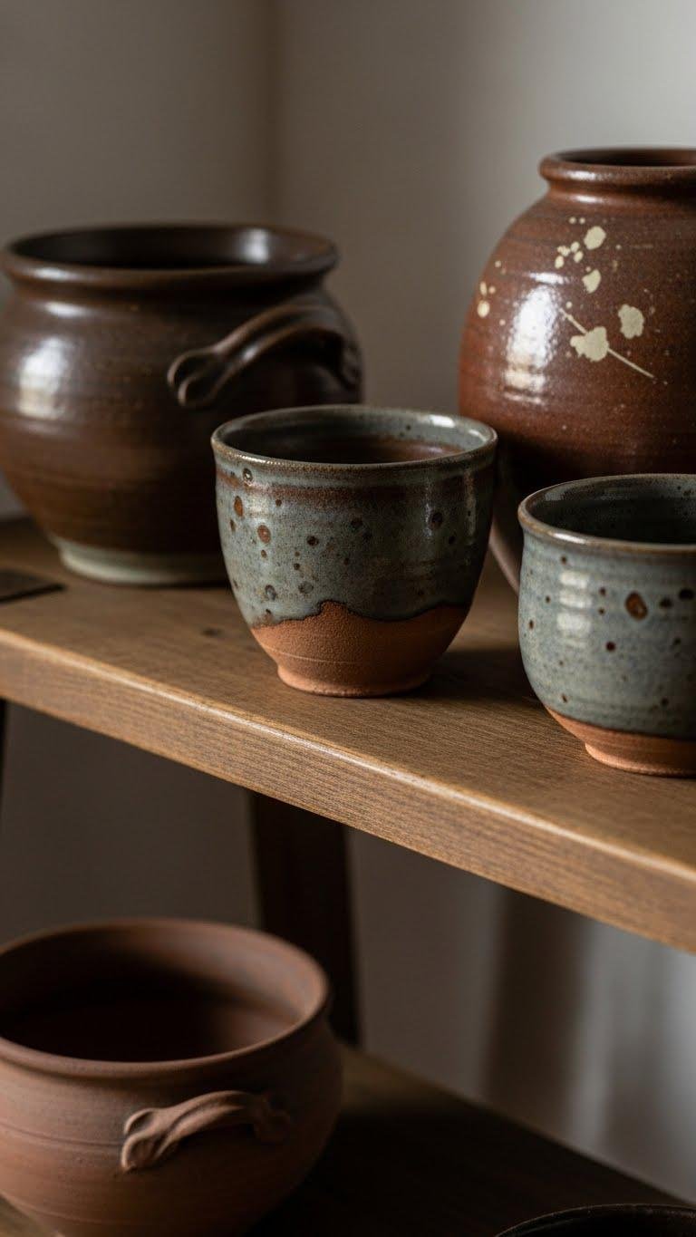 Set out a few well-worn pots and ceramic vessels to give your space quiet character without clutter. You’ll choose pieces showing patinated glaze, subtle kiln markings, and honest fingerprint impressions. Arrange them sparingly on open shelves or a bench, letting terra sigillata catch low light. This restrained display feels liberated, tactile, and undeniably personal without excess.