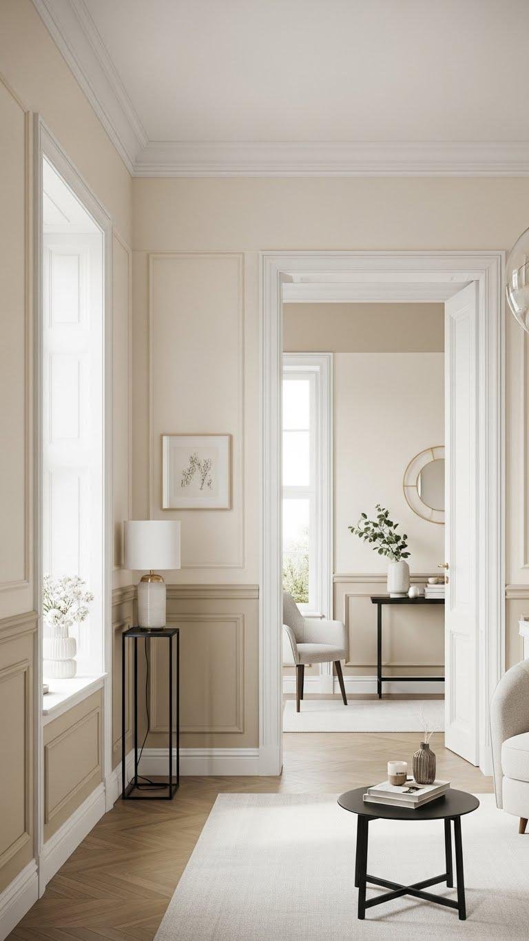 When you layer cream tones on walls and anchor them with crisp white trim, the room instantly feels more intentional and refined.