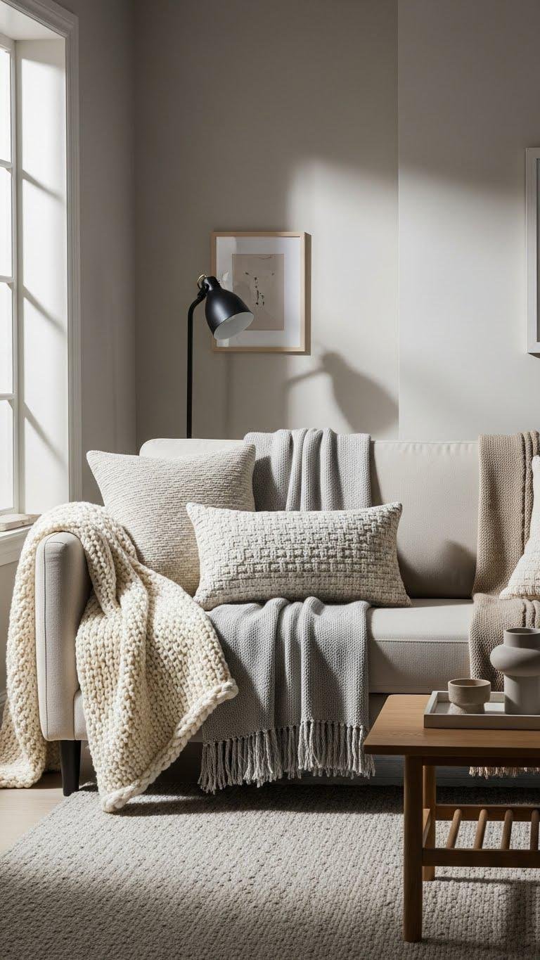 You’ll emphasize neutral layering with varied weaves, knotting a textured lumbar at one end and tossing a chunky knit across the back. This keeps the look relaxed, refined, and effortlessly free.