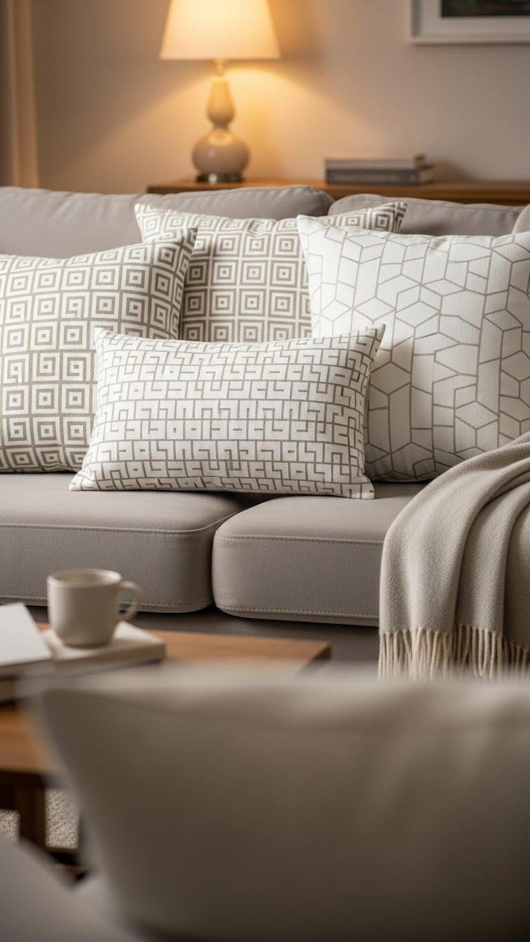 Subtly patterned geometric cushions quietly sharpen a white-and-beige scheme, adding structure without breaking the room’s calm.