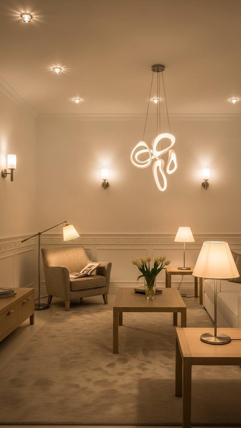 You’ll balance soft ambient illumination with task lamps for reading and dimmable sconces for mood control, while layered pendants provide sculptural accent points.