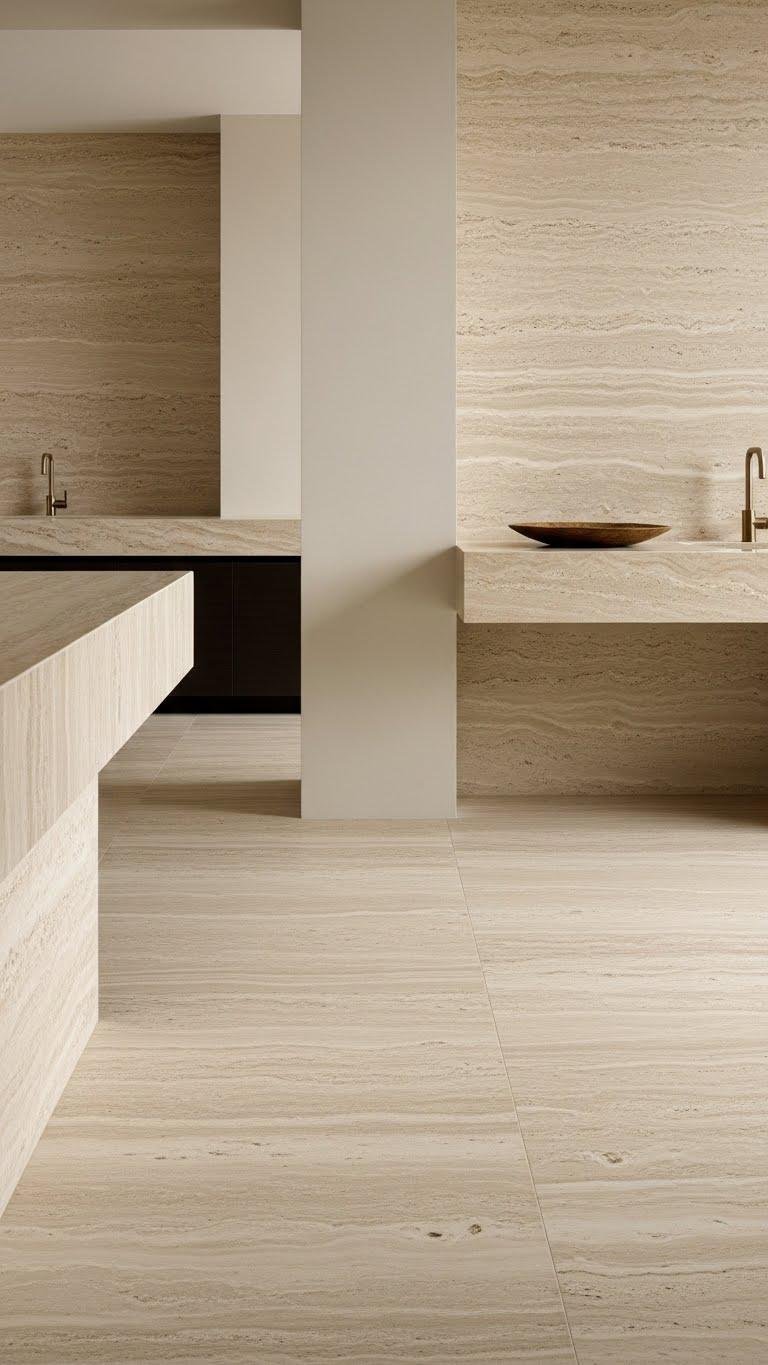 Choose beige marble or natural stone with a sealed finish when you want timeless warmth paired with practical durability. You’ll appreciate honed honed surfaces that feel subtle underfoot and resist wear. Sealants protect against stains while revealing soft mineral veining that adds quiet character.