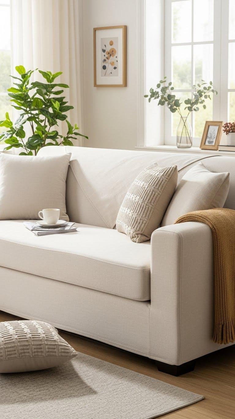 Though understated, a pale beige sofa becomes a confident anchor once you layer in textured throws; they add depth, contrast, and tactile interest without overpowering the calm palette.