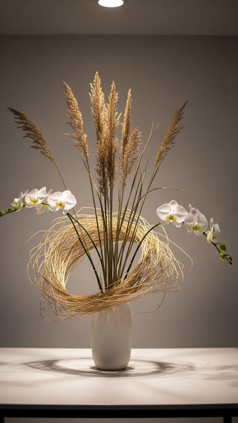 To keep that serene, textural look feeling fresh through the year, rotate seasonal accents in muted earth tones—think warm clay, soft ochre, sage gray, and washed terracotta—to complement your dried grasses and white orchids.