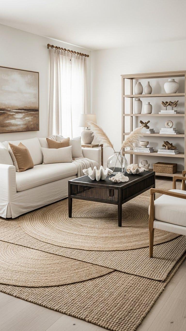 A tonal jute or sisal rug grounds a neutral room by adding natural texture and subtle color variation without stealing the show; pair similar hues to reinforce calm continuity or choose slightly darker weaves to anchor furniture and define zones.