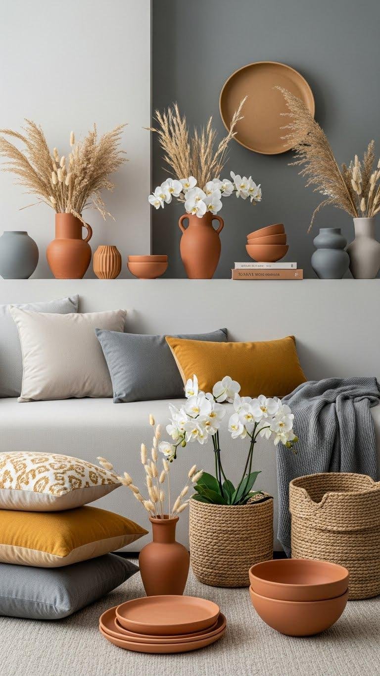 You’ll swap pillows, throws, and ceramics in muted terracotta and ochre, add spun sisal baskets for ground texture, and choose pieces that let you rearrange freely with intentional restraint.