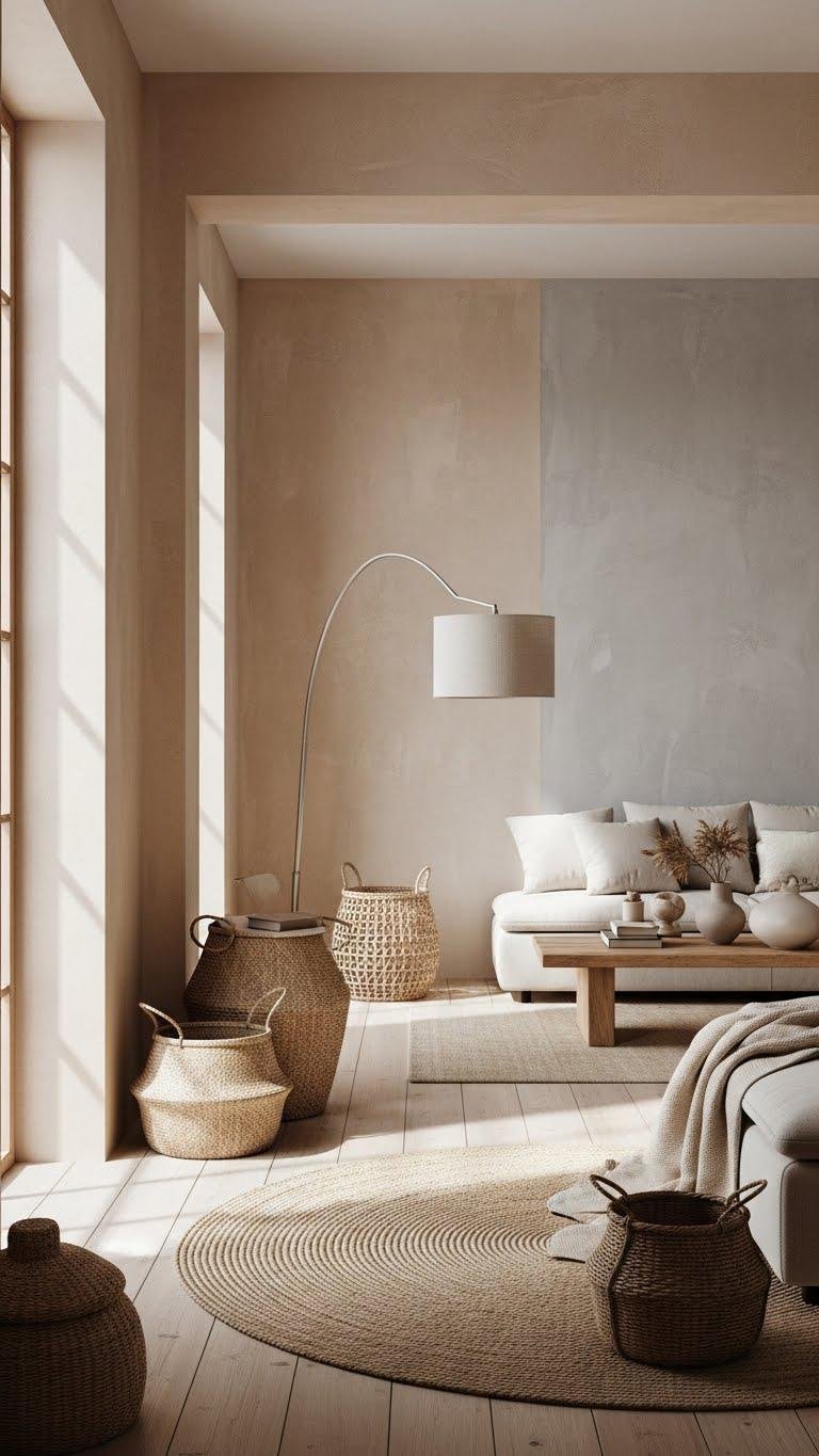 You’ll use handwoven baskets for effortless storage and sculptural decor, pairing them with rattan pendant lights to create layered light and shadow. Mix sizes, keep finishes natural, and let organic shapes introduce relaxed sophistication without overpowering your serene neutral canvas.