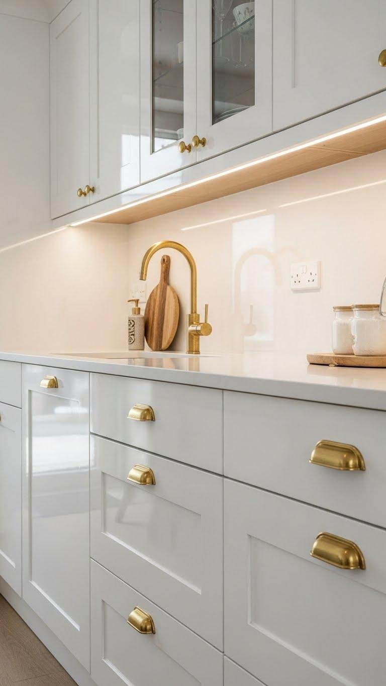 When you pair high-gloss lacquered white cabinets with warm brass hardware, the result reads both modern and inviting—clean, reflective surfaces amplify light while the brass adds a tactile, human scale that prevents the look from feeling cold.