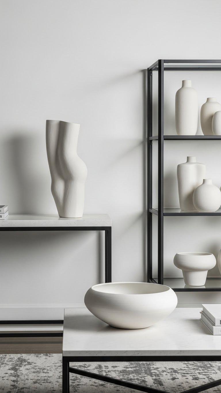Place sculptural white pottery where it can be seen and felt: a tall, asymmetrical vase on a console, a low, rounded bowl on a coffee table, or a cluster of matte-finished vessels on open shelving.