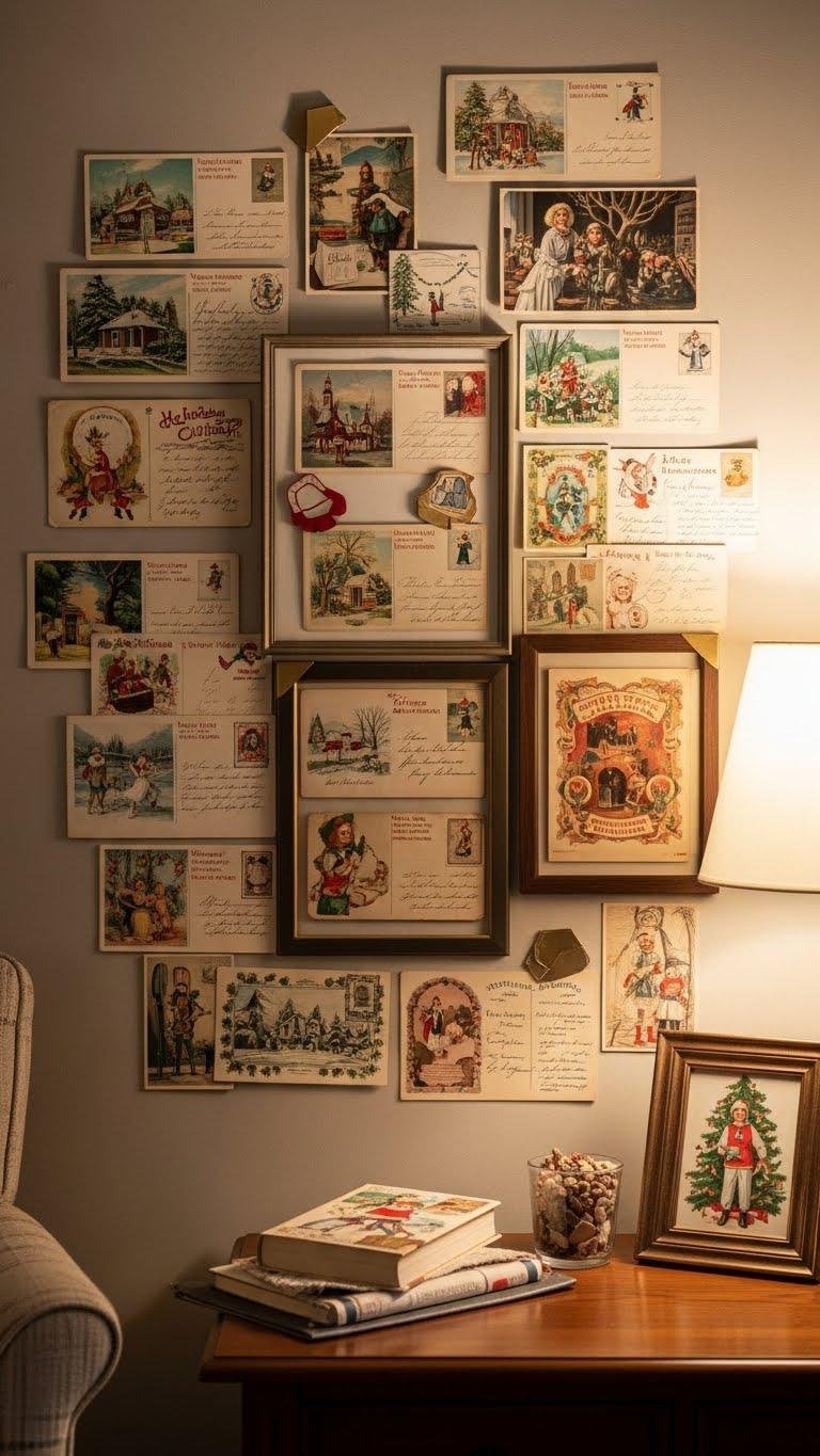 Mix old-fashioned charm with modern display by arranging antique holiday postcards into a layered wall collage that feels curated, not cluttered. You’ll celebrate faded ephemera while keeping edges protected with simple frames or archival corners for postage preservation.