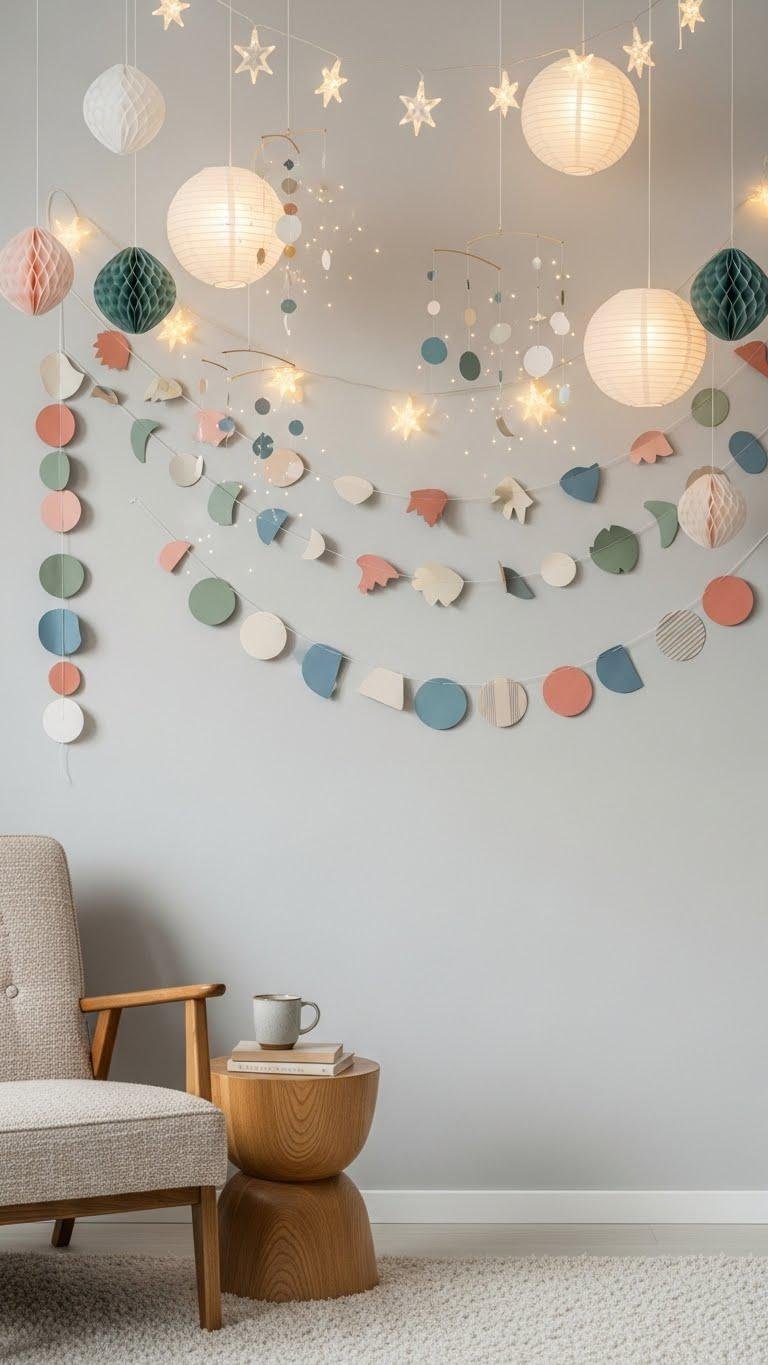 You’ll drape twinkling mobiles and paper lanterns across a blank wall, creating soft depth and motion.