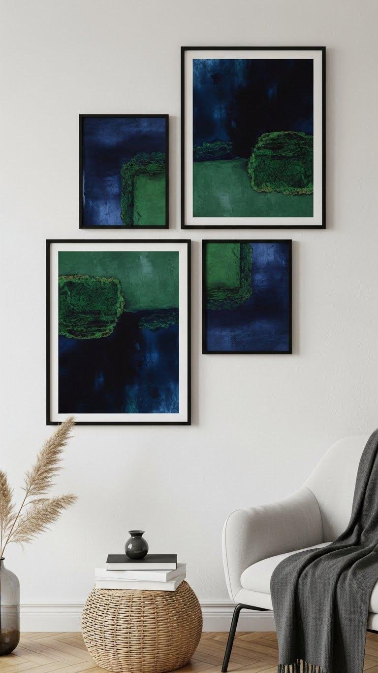 You’ll love a framed duo that balances deep indigo washes with textured moss pairing accents. Hang pieces asymmetrically, let negative space breathe, and keep accessories minimal so the colors read bold, freeing, and contemporary.