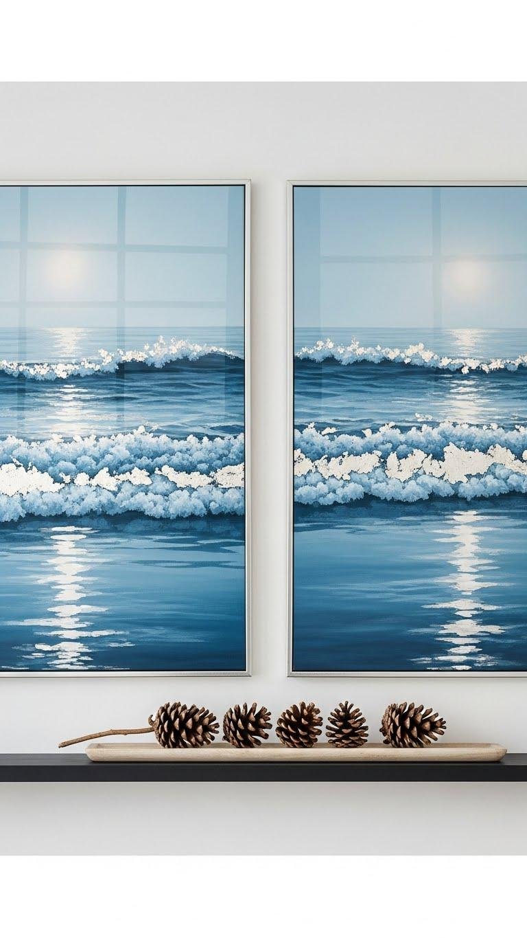 You’ll frame an icy seascape, emphasize frosted waves with silver leaf, and tuck coastal pinecones into a slim shelf beneath the art.