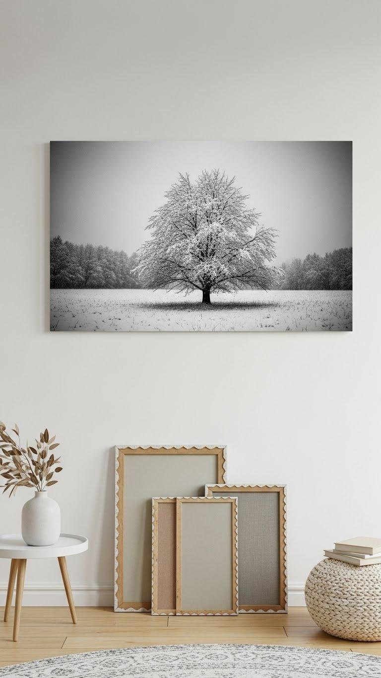 When you anchor a wall with an oversized snowy tree print, the room instantly gains a graphic, wintry focal point that feels both calm and dramatic.
