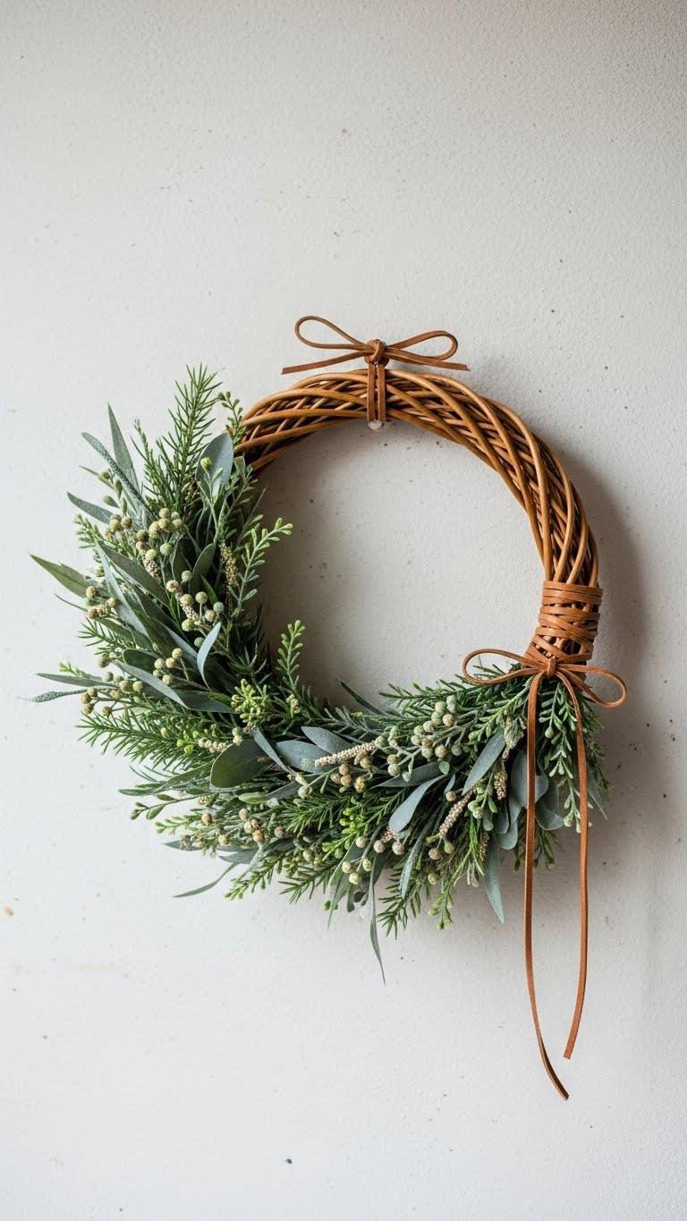 Bring in natural texture with a rattan wreath woven through with fresh or faux greenery to make a subtle, sculptural statement on your wall. You’ll love its airy silhouette—pair muted tones, leather ties, and asymmetrical sprigs for a liberated look.